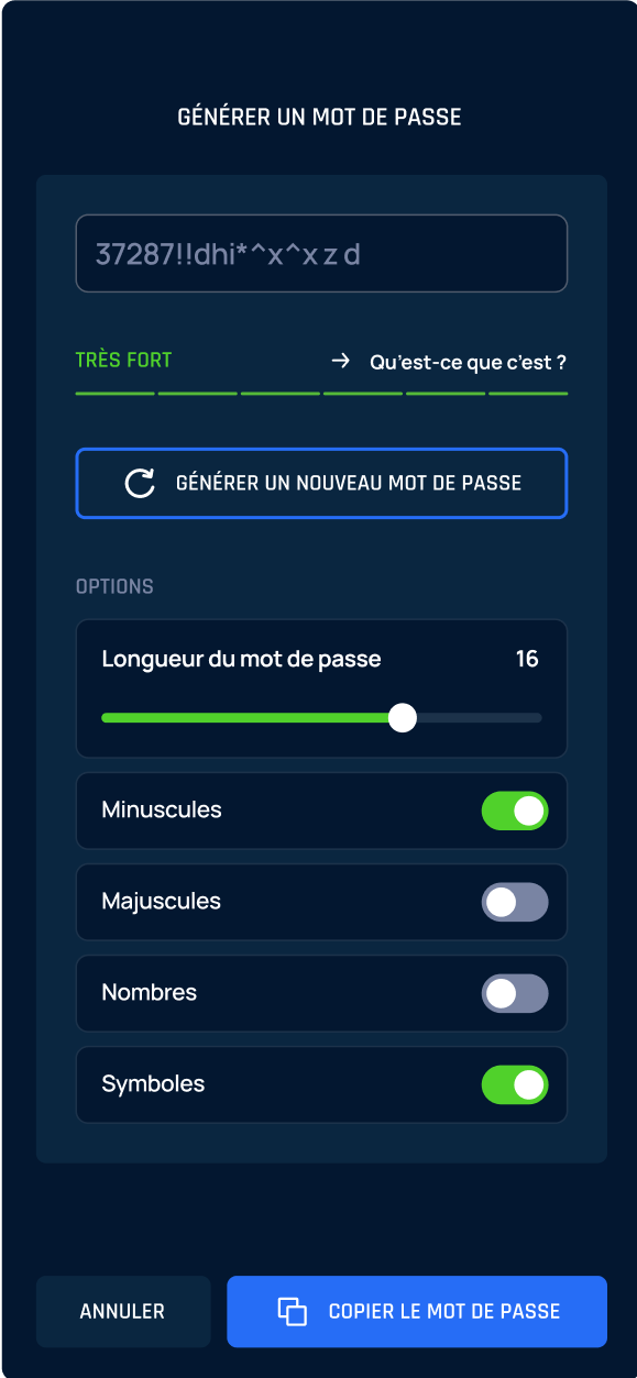 La création de compte devient facile et sécurisée. Créez des mots de passe uniques et complexes en un clic. Notre générateur personnalise chaque mot de passe pour répondre aux exigences des différents sites et applications, en incluant des lettres, des chiffres et des symboles. Dites adieu aux mots de passe réutilisés et faibles !